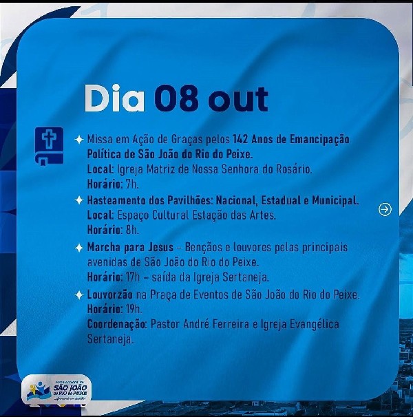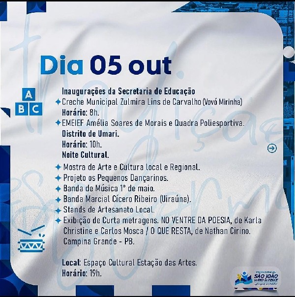É uma data muito importante para todos nós, pois marca a nossa independência e a construção da nossa história. Teremos diversas atividades culturais e artísticas, além de shows e apresentações musicais para toda a família.