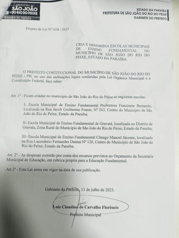 O projeto de Lei de Nº 018/2023, da Prefeitura Municipal de São João do Rio do Peixe, foi aprovado em sessão extraordinária criando três escolas Municipais, ou recebendo as referidas escolas que pertenciam ao Estado e agora passaram para o Município.