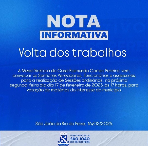 A Câmara Municipal de São João do Rio do Peixe informa que as sessões ordinárias do Poder Legislativo serão retomadas nesta segunda-feira, 17. O presidente da Câmara, vereador Rivelino Ribeiro(Riva) destaca a importância do retorno para discutir e aprovar projetos que beneficiem a população.
